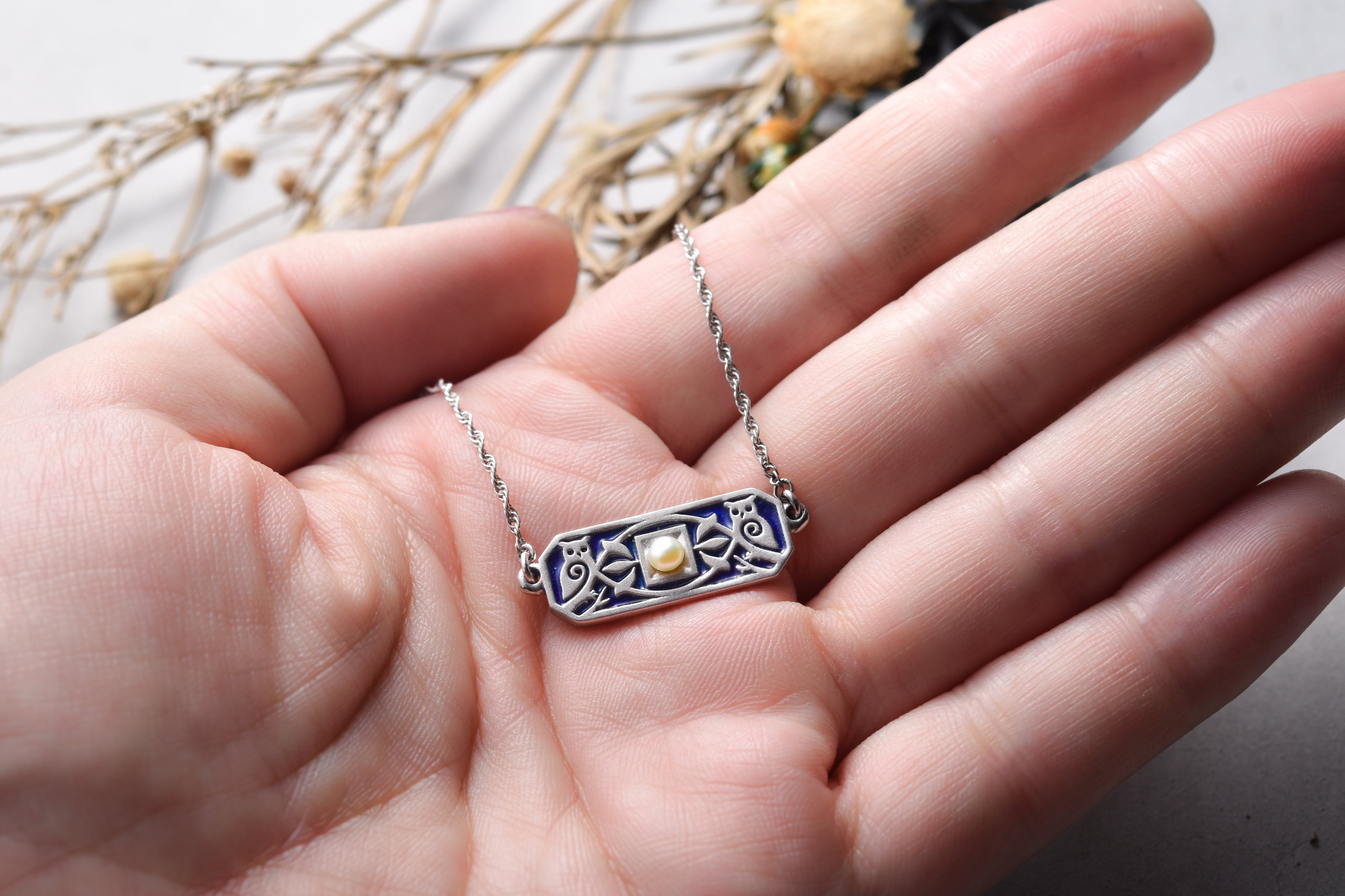 深いロイヤルブルーの七宝と、マットなシルバーのコントラストが美しいペンダントです。
