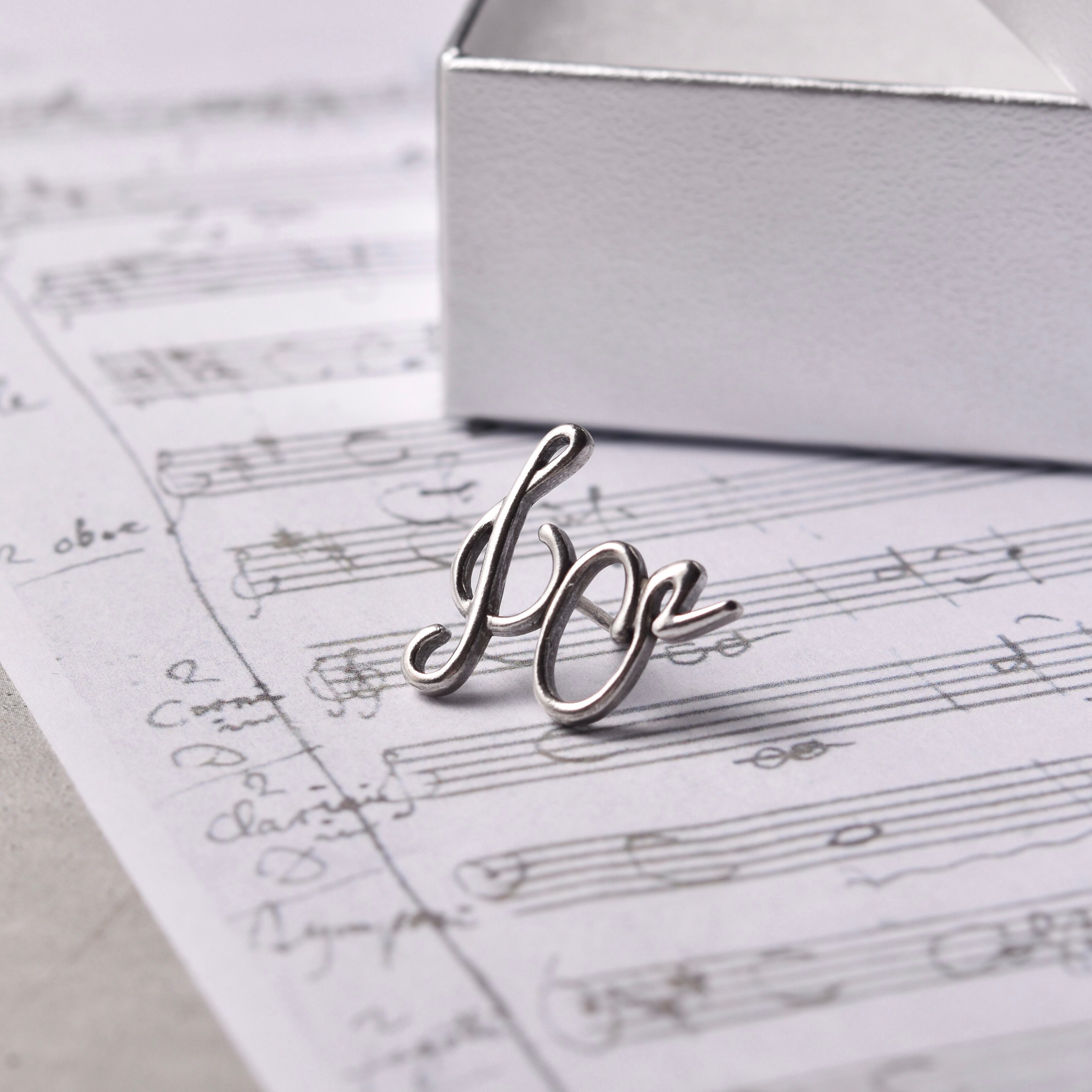 モーツァルトの自筆譜から生み出した、ト音記号とヘ音記号のシルバー製のピンバッジです。