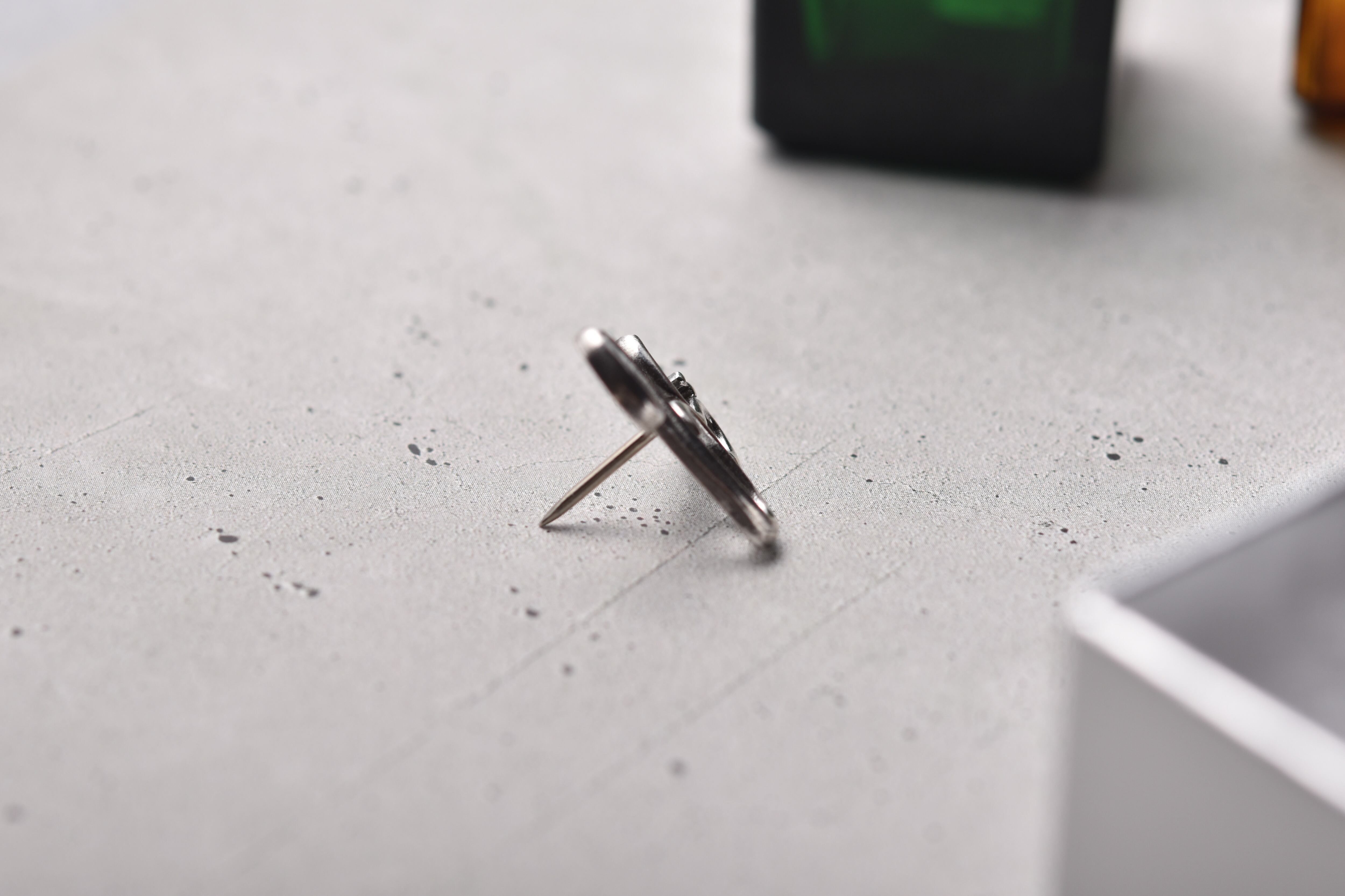 シンプルなデザインですので、帽子に、ジャケットの胸元に、ストールに、ワンポイントとして。